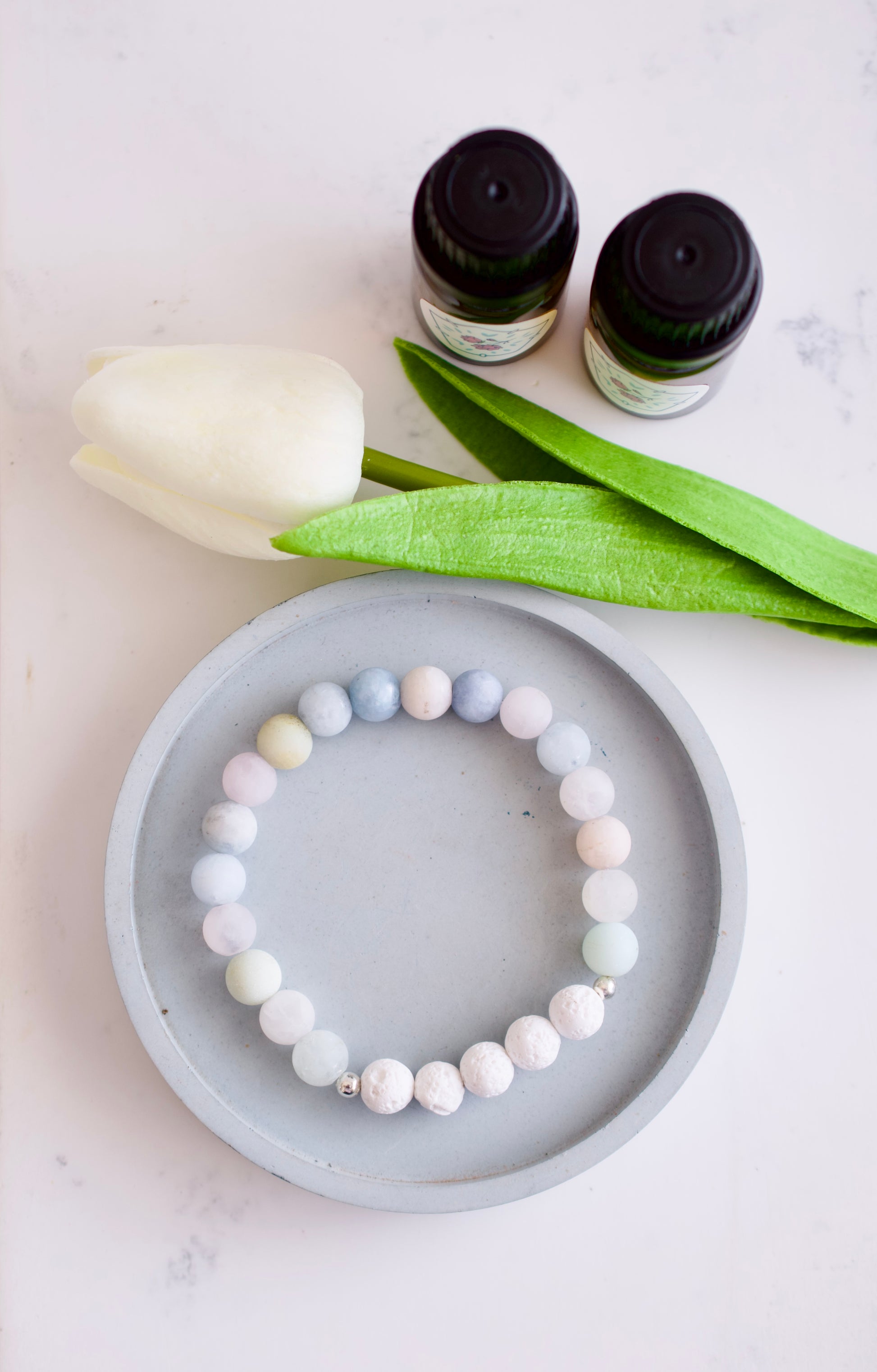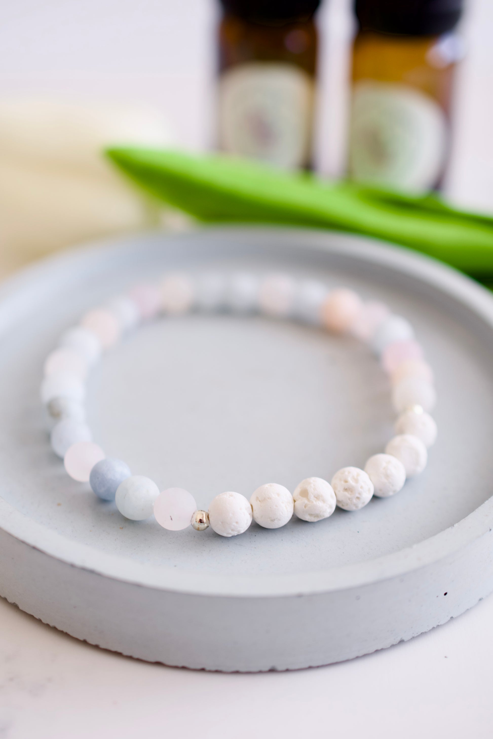 Soft and elegant, this bracelet features pastel morganite beads, white lava stone, and silver accents. The porous lava beads double as natural diffusers—just add a drop of your favorite essential oil for a subtle, all-day scent. Perfect for stacking or wearing solo.