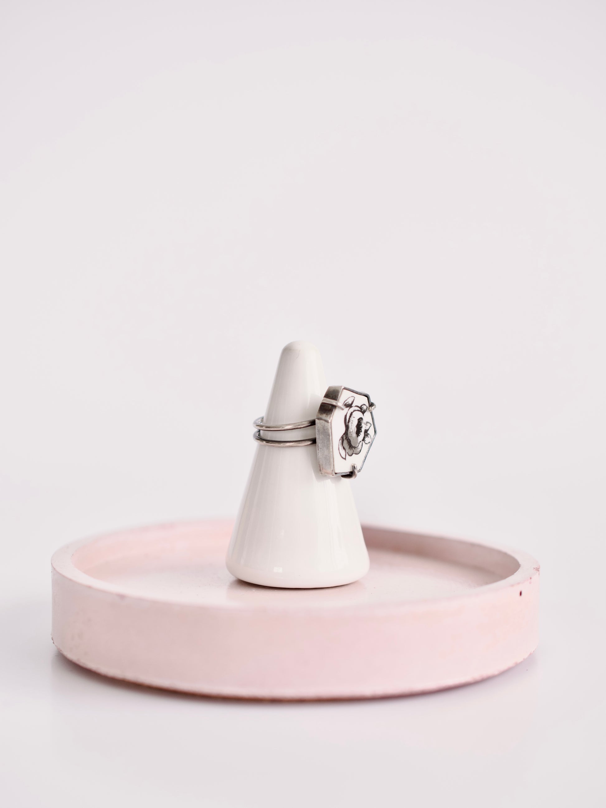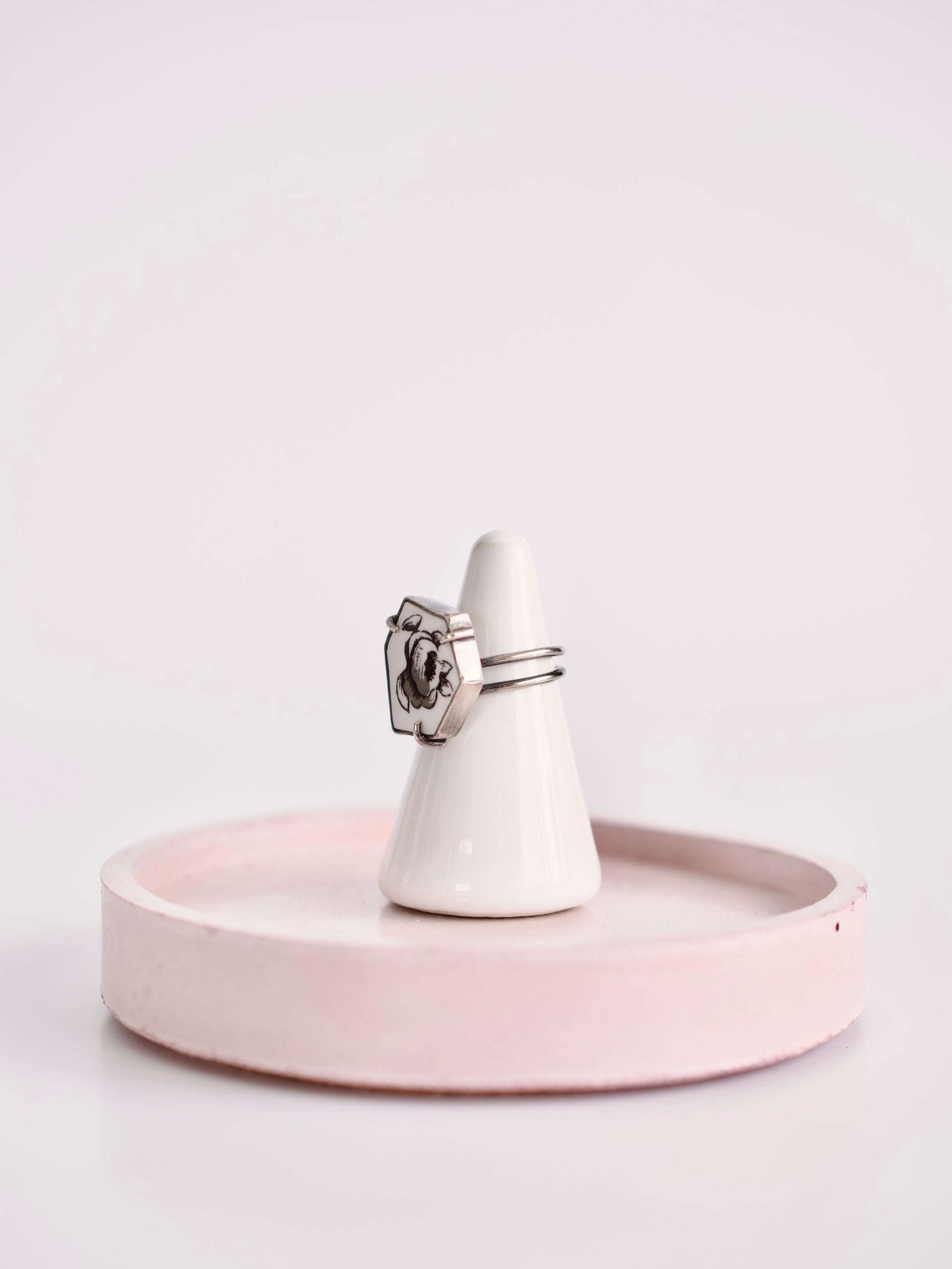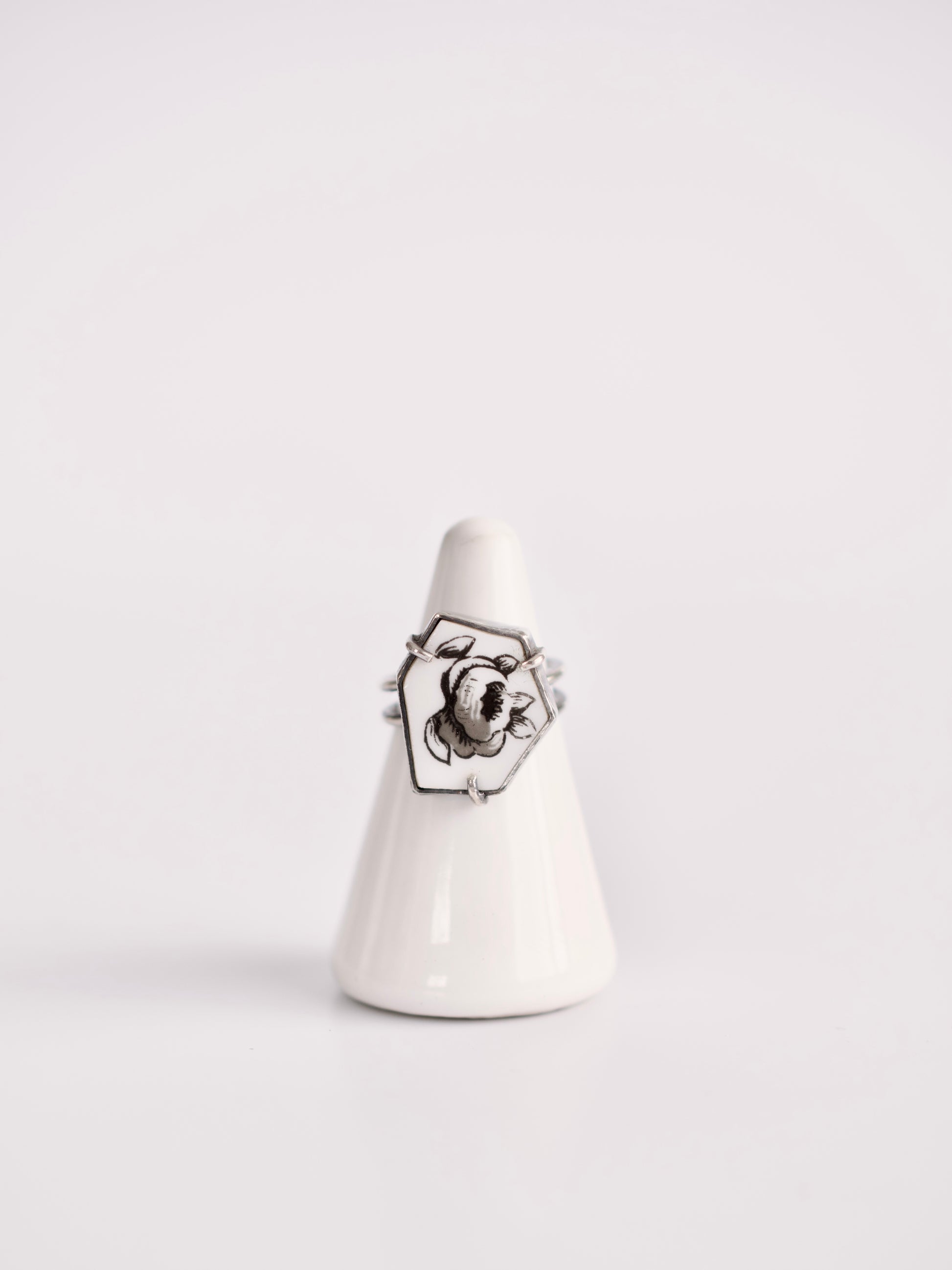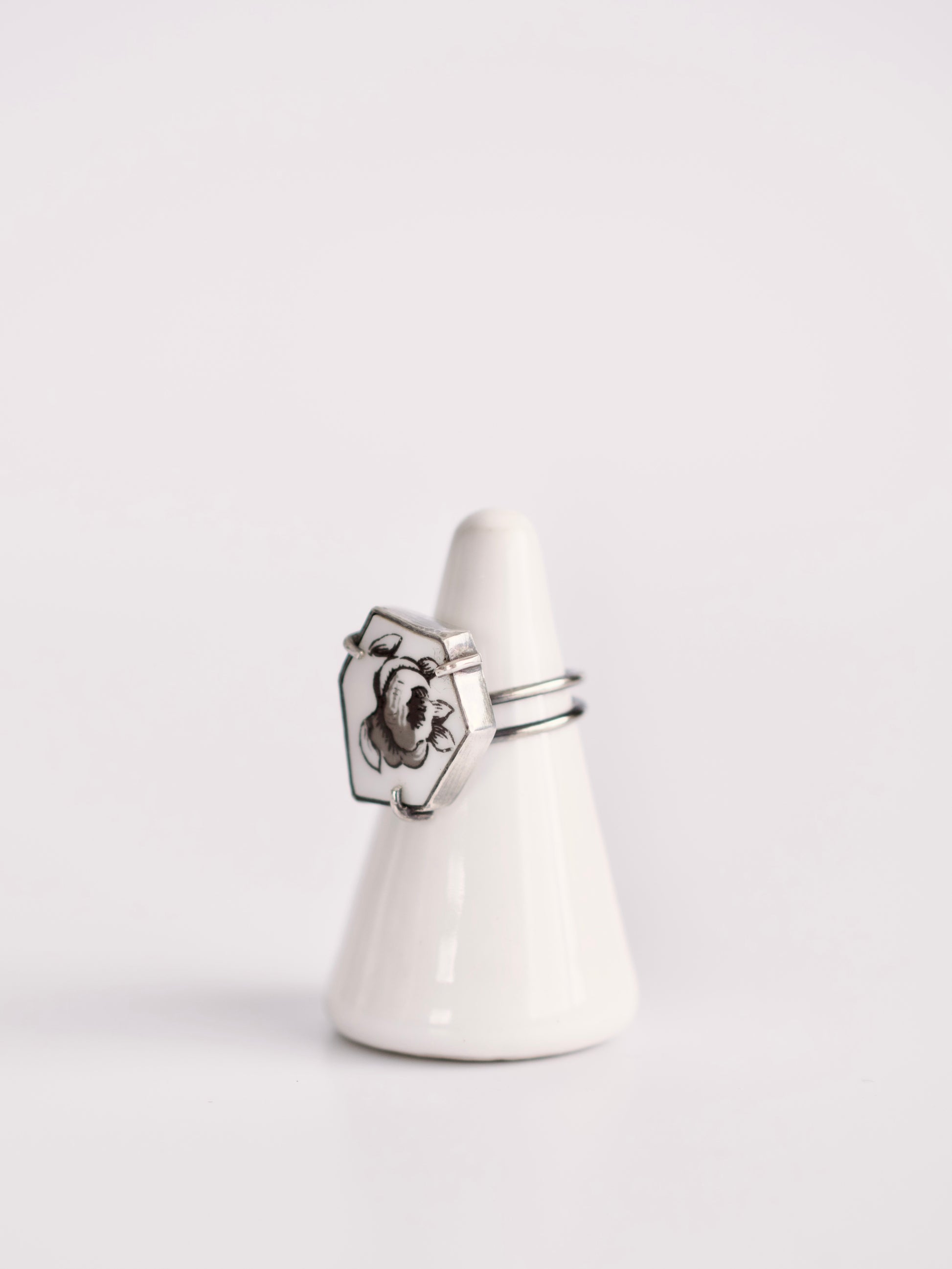 Striking and unique, this ring features a piece of broken plate with a bold black rose design. Set in sterling silver with slight oxidation, it has a warm, vintage-inspired feel that enhances its timeless beauty. Handcrafted with care, it’s a one-of-a-kind piece that makes a subtle yet powerful statement.