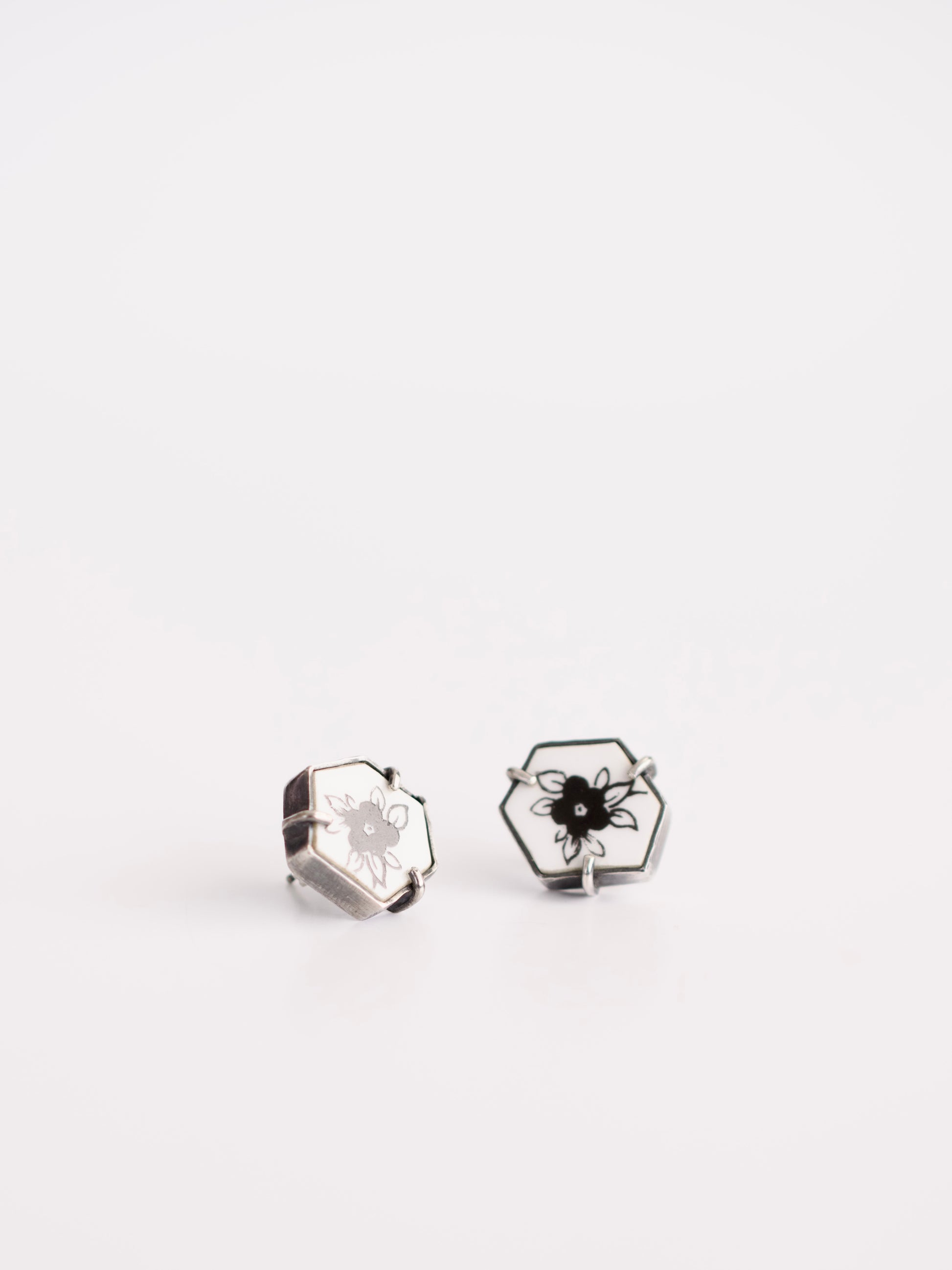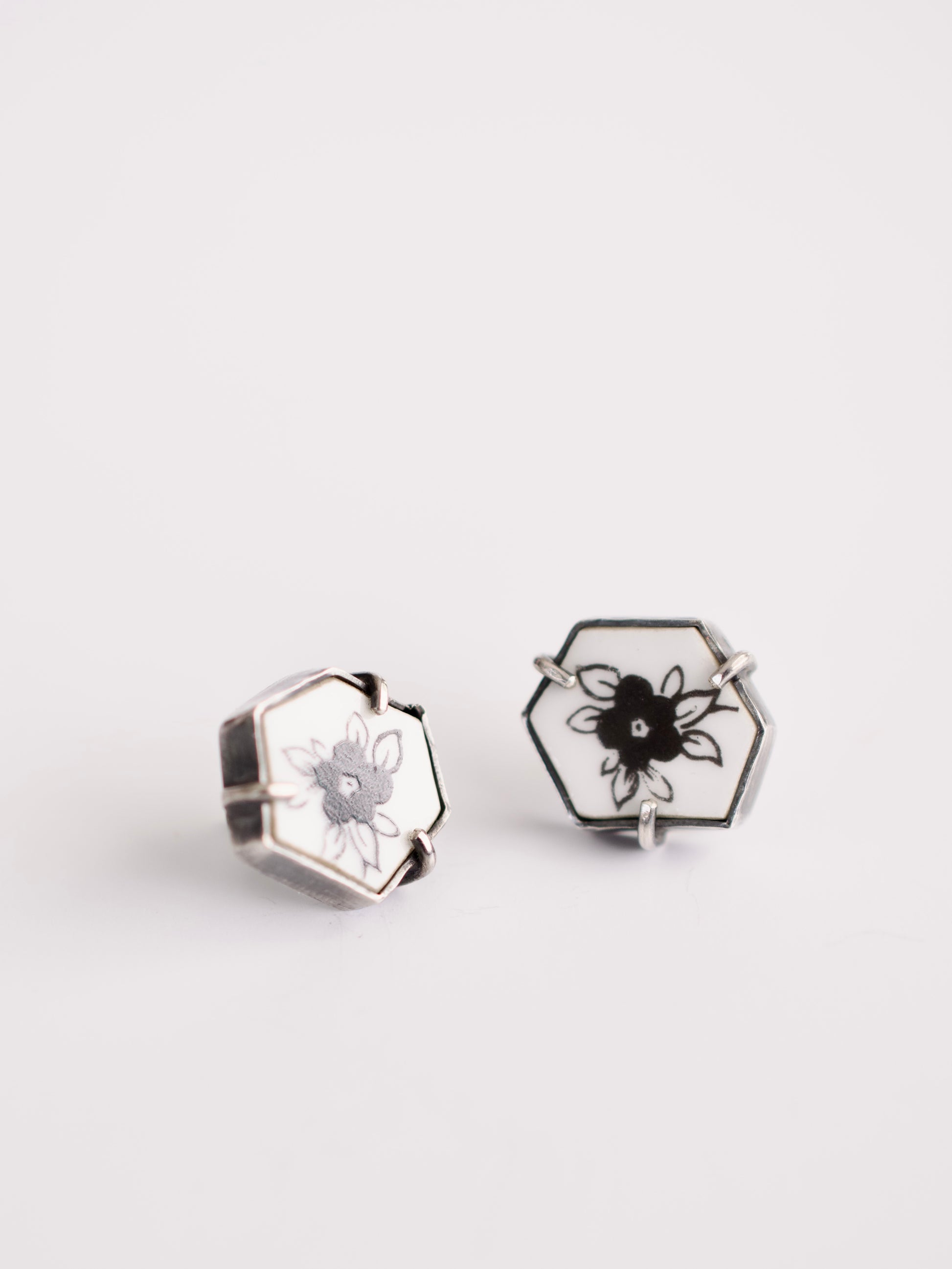 Simple yet striking, these stud earrings feature pieces of broken plate with a delicate black wildflower design. Framed in sterling silver, the geometric shapes give them a timeless appeal, perfect for everyday wear. Handcrafted with care, they’re a subtle statement of beauty and uniqueness.
