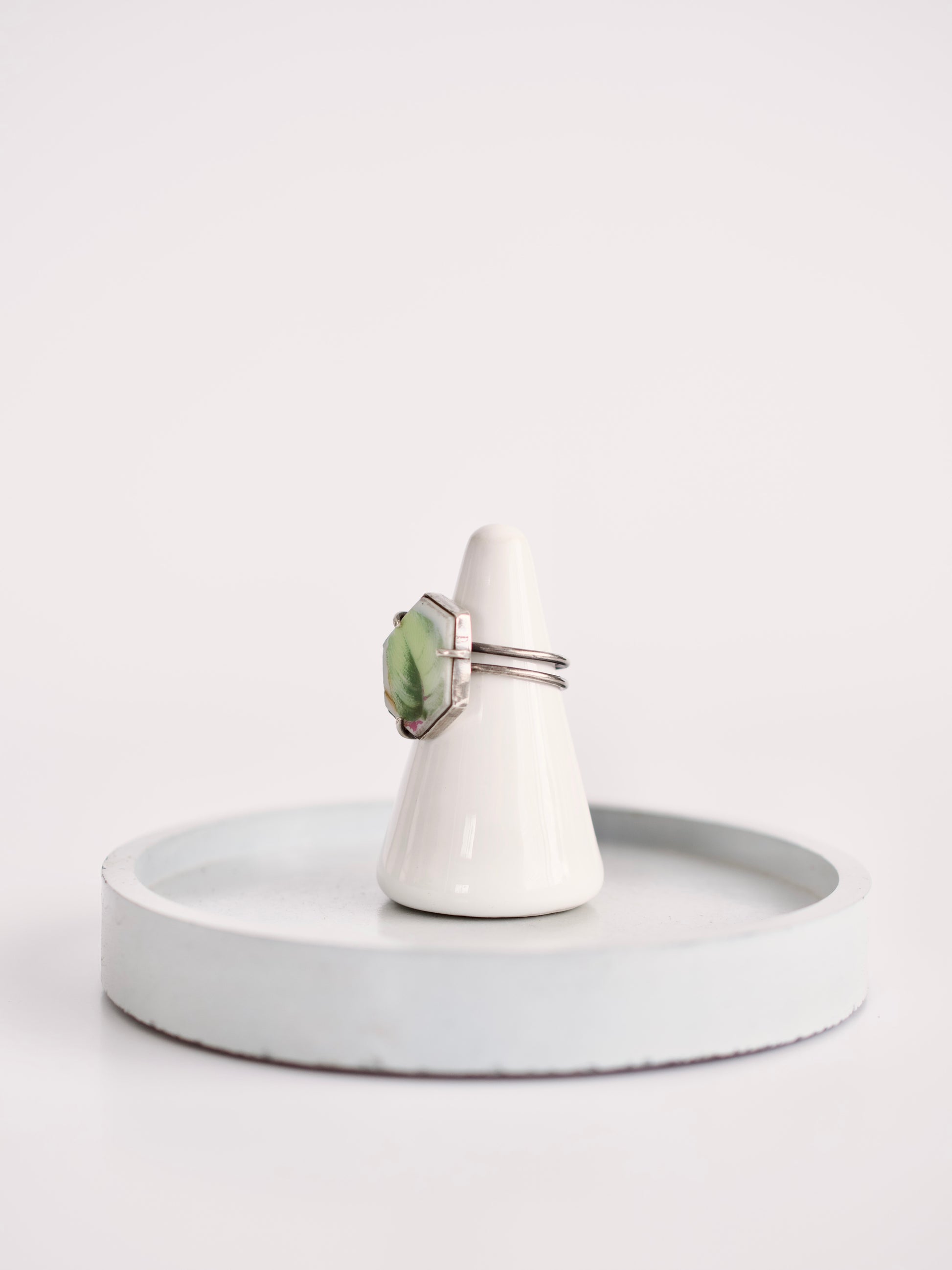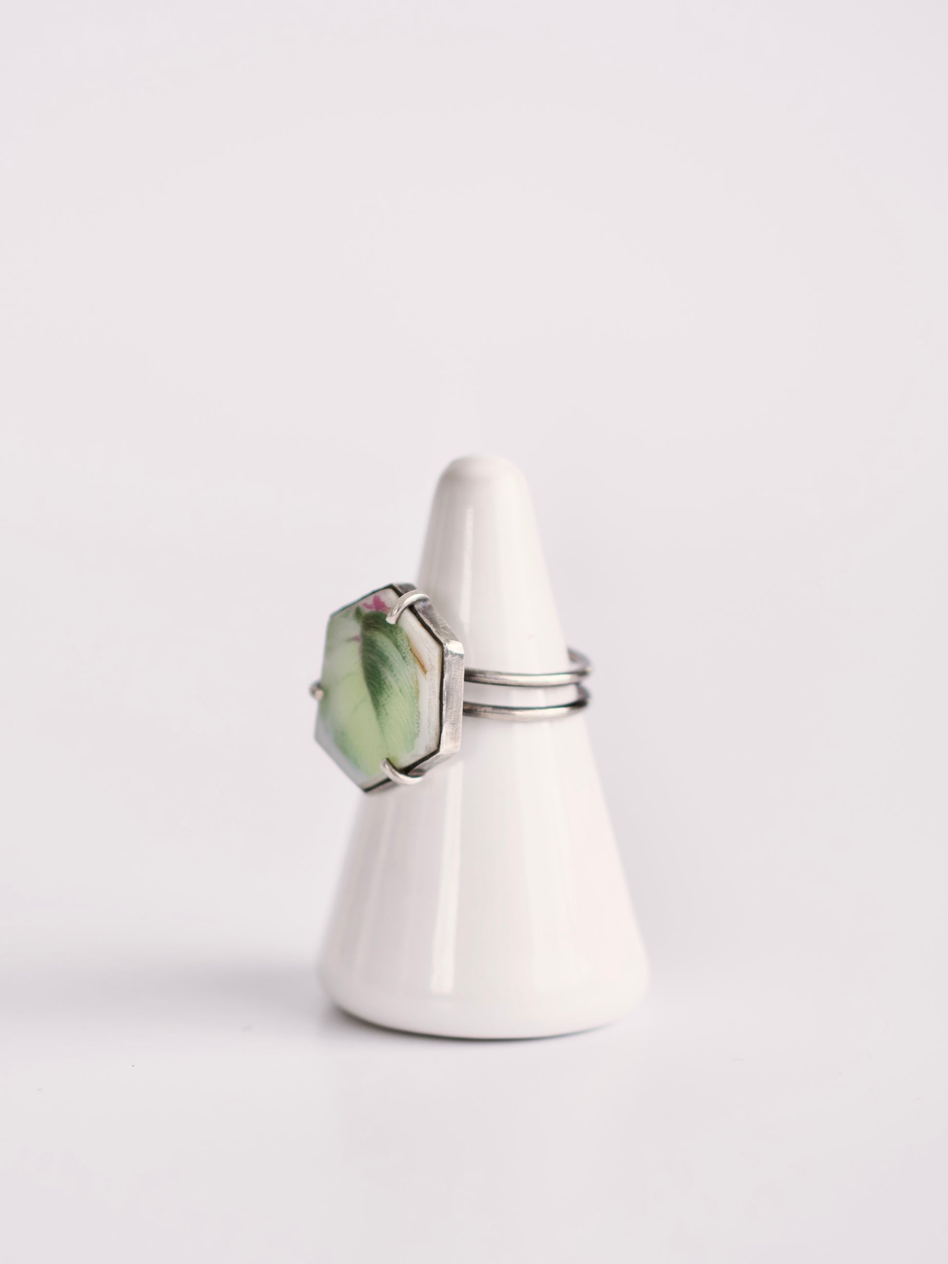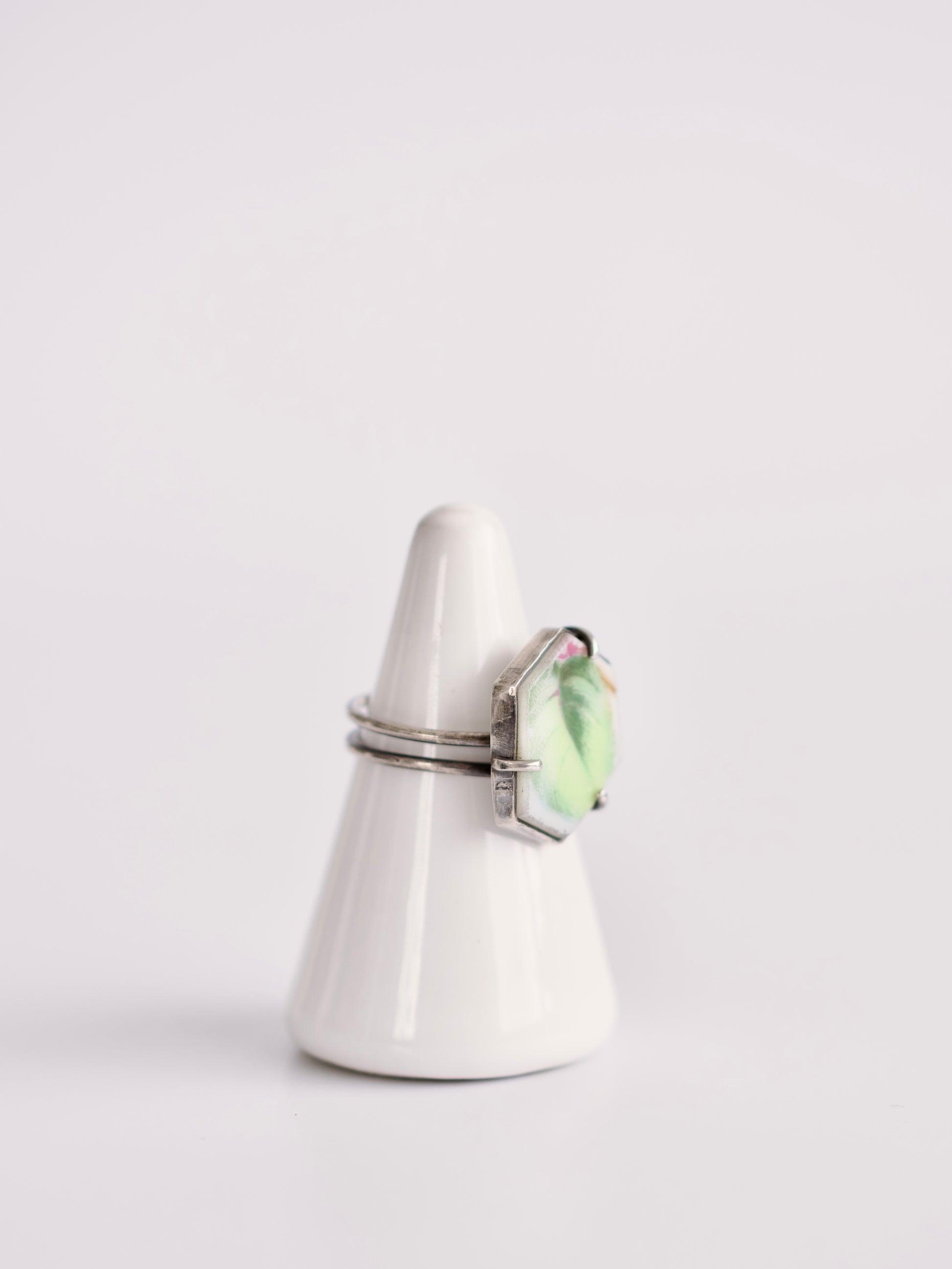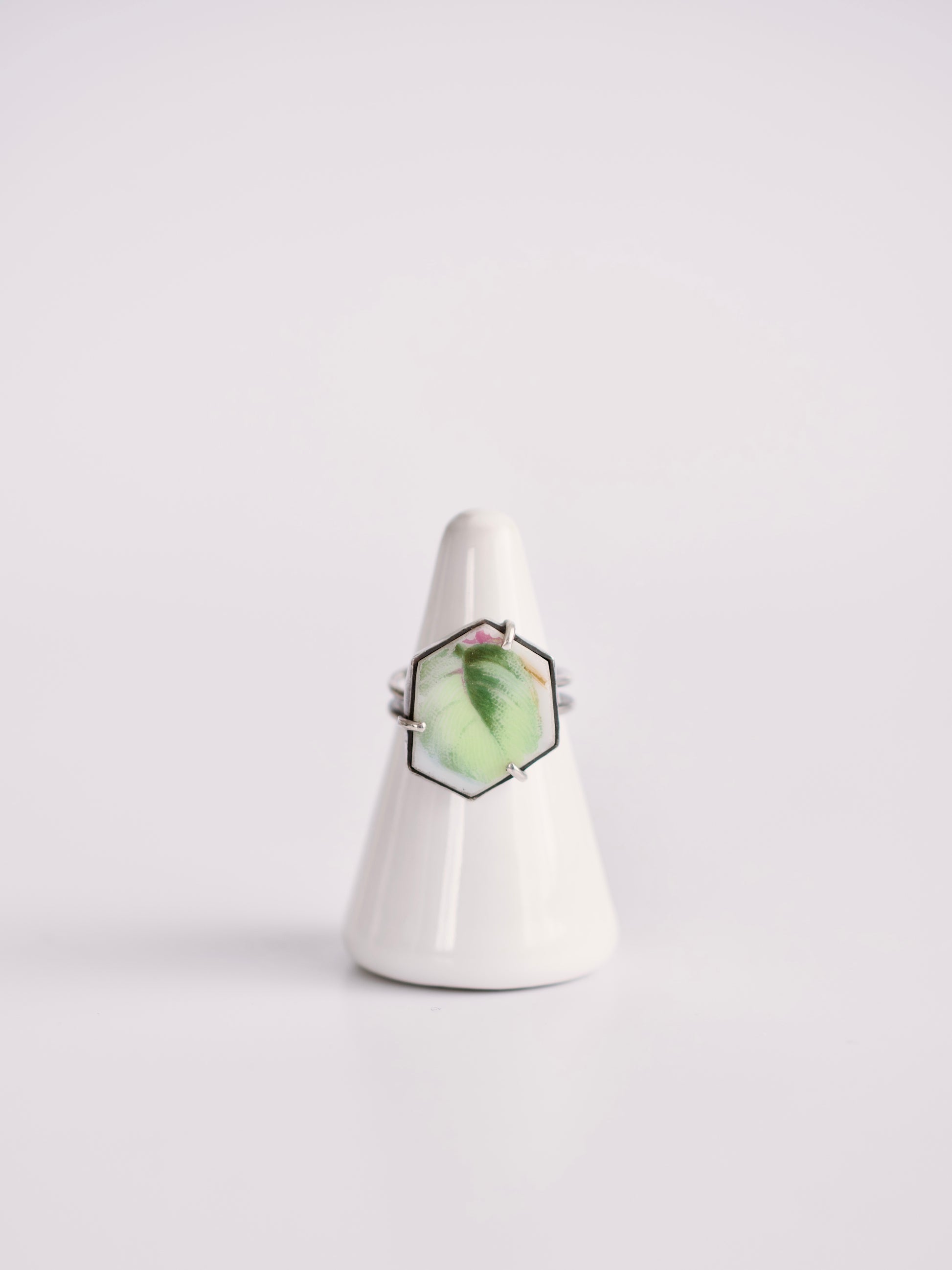 Fresh and elegant, this ring features a piece of broken plate with a delicate green leaf design. Set in sterling silver, the sleek finish highlights the natural beauty of the plate. Handcrafted with care, it’s a one-of-a-kind piece that adds a subtle, earthy charm to any look.
