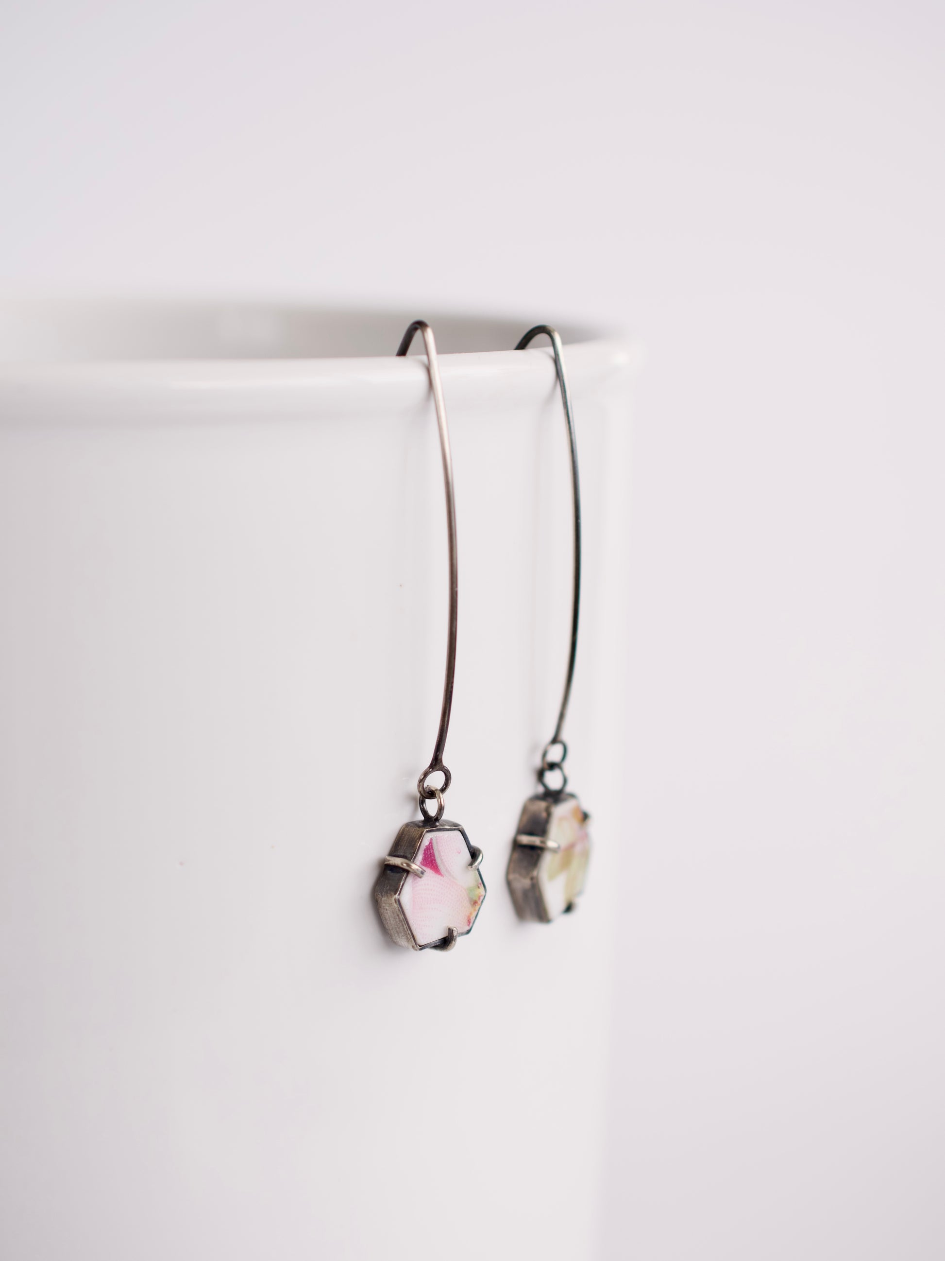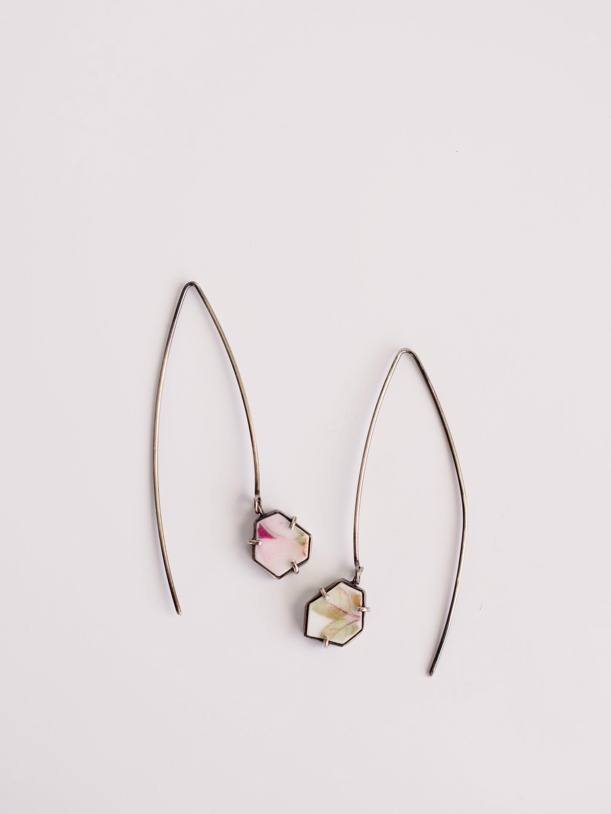 Soft and romantic, threader earrings feature pieces of broken plate with a delicate rose design in shades of pink and soft orange. The sterling silver chain adds graceful movement, making them light and elegant. Handcrafted with care, they’re a unique blend of color and charm that’s perfect for any occasion.