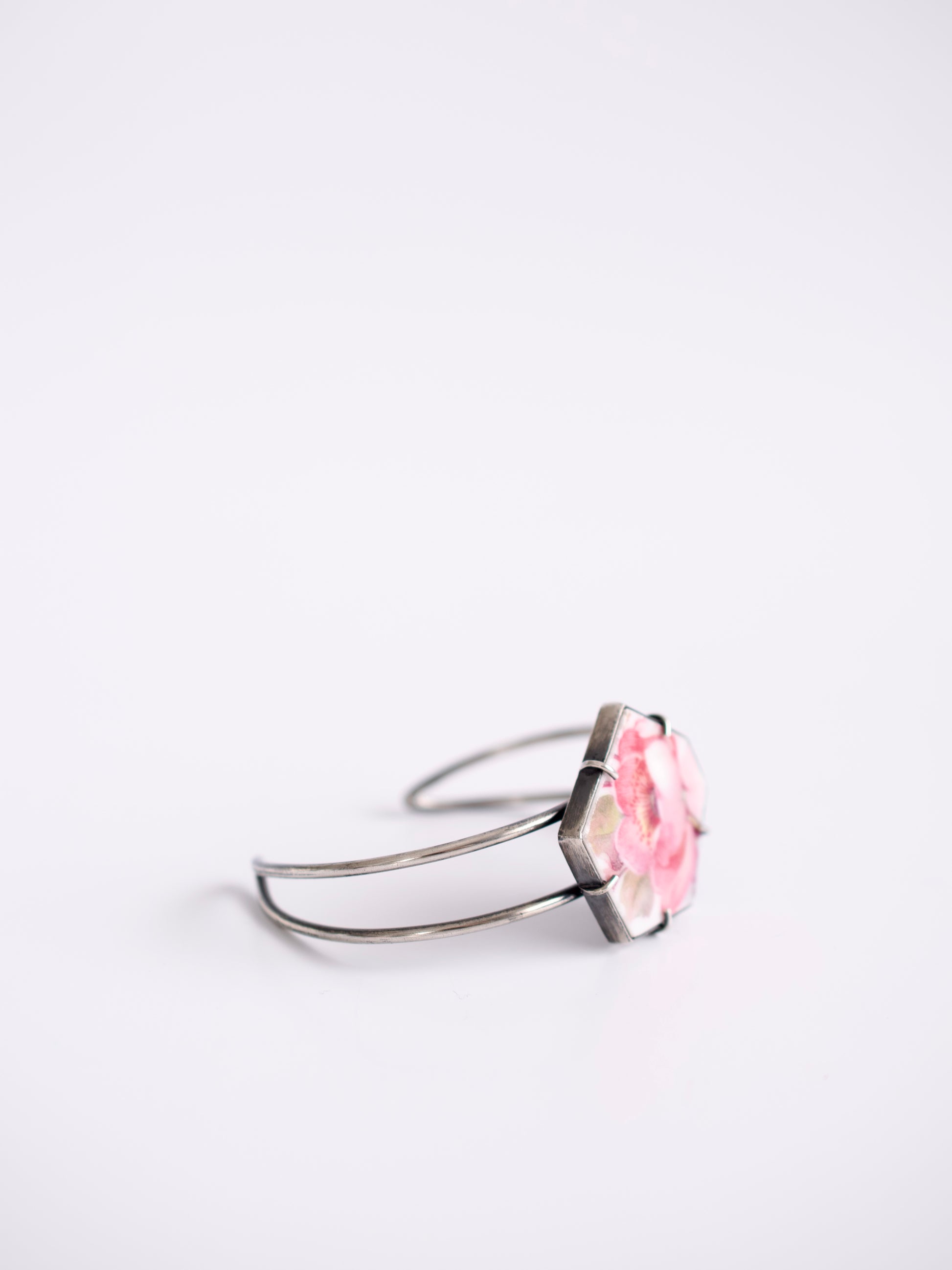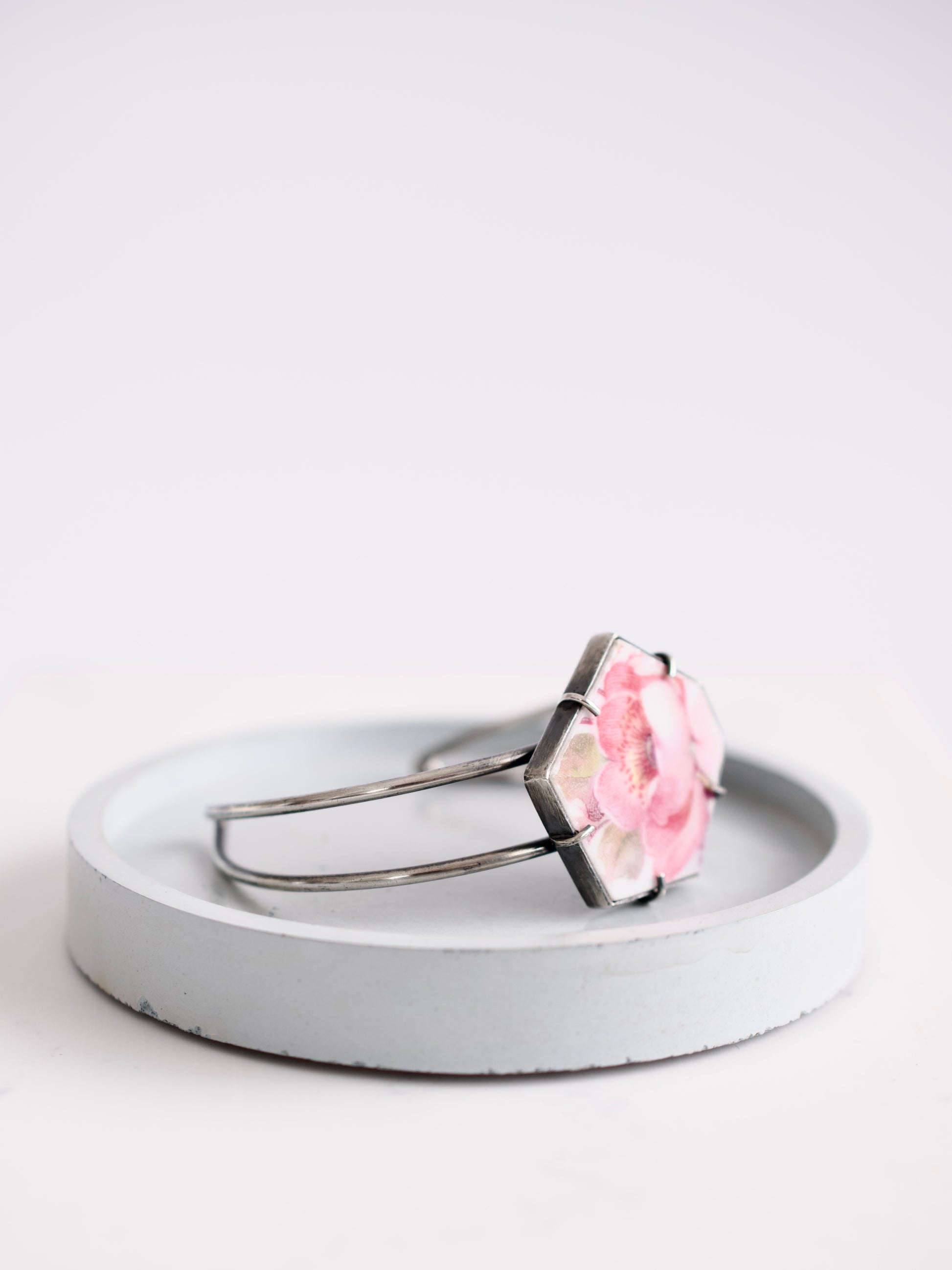 This double cuff bracelet features a piece of broken plate with a soft pink rose design, making it a true one-of-a-kind treasure. The sterling silver setting has a slight oxidation that adds warmth and depth, giving the piece a vintage-inspired charm. Handcrafted with care, it’s a timeless accessory with a story to tell.