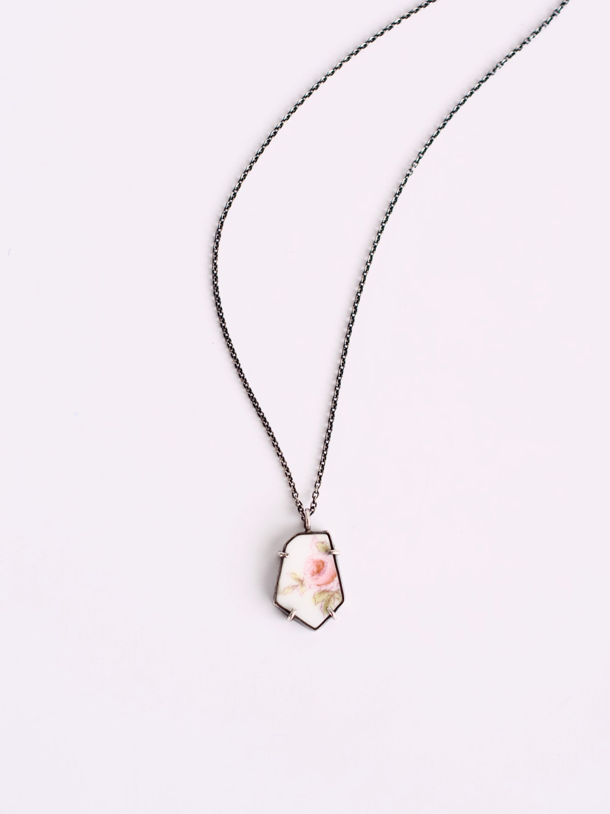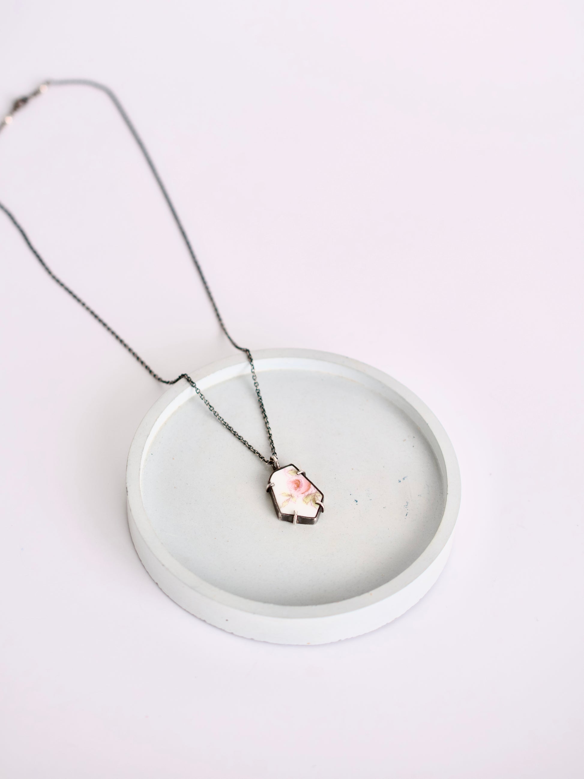 Soft and elegant, this necklace features a piece of broken plate with a delicate pink rose design. The sterling silver setting has a slight oxidation, adding a touch of vintage-inspired warmth. Handcrafted with care, it’s a dainty piece that brings a hint of timeless beauty to any look.