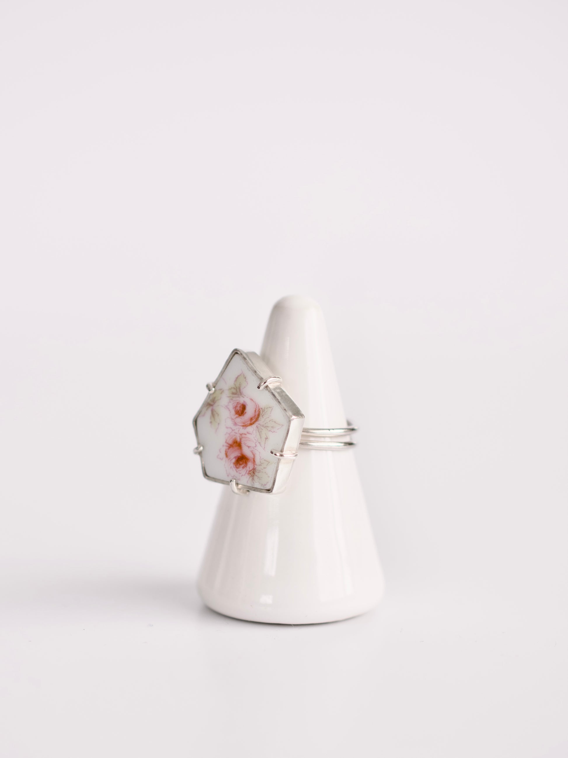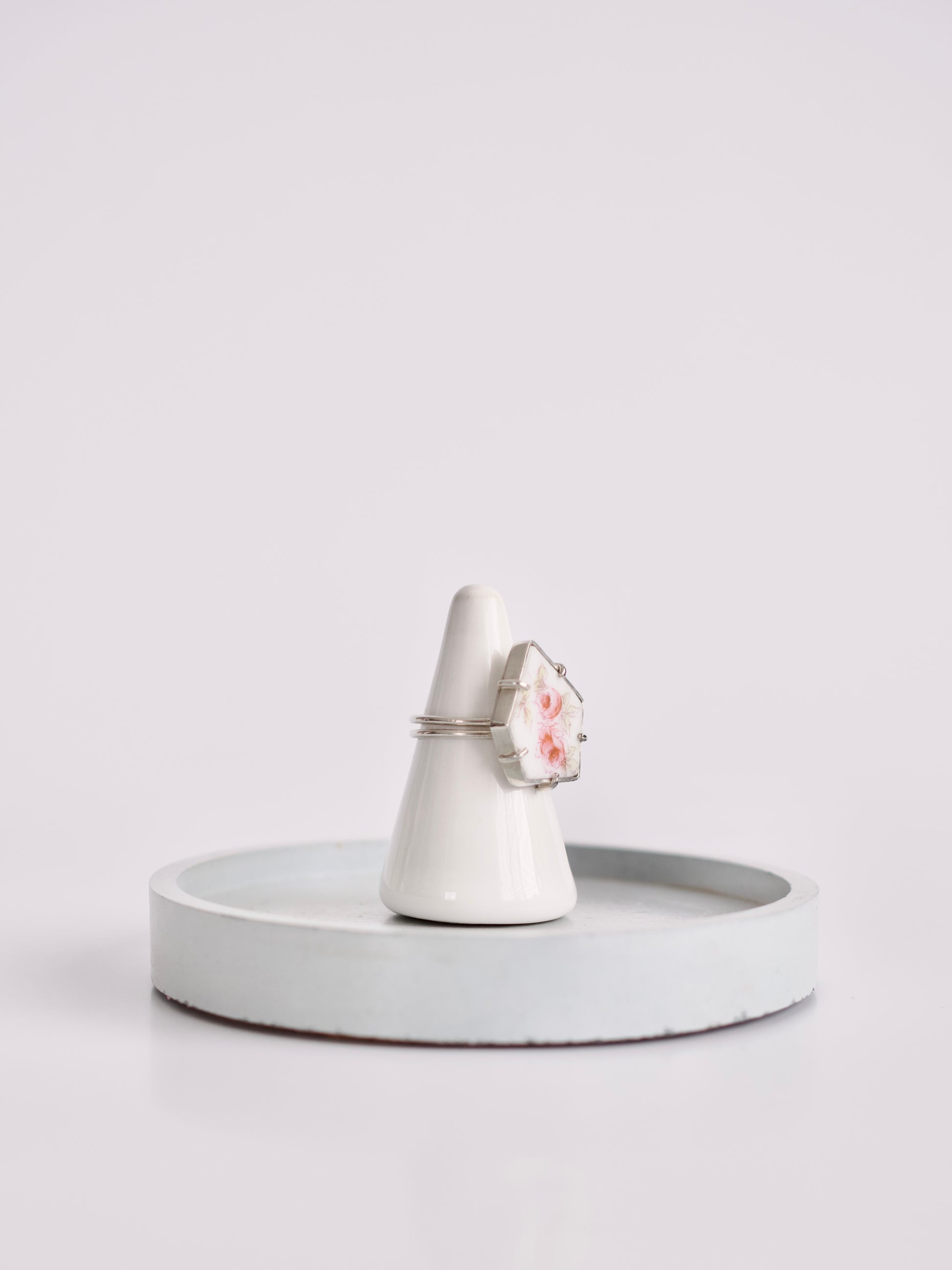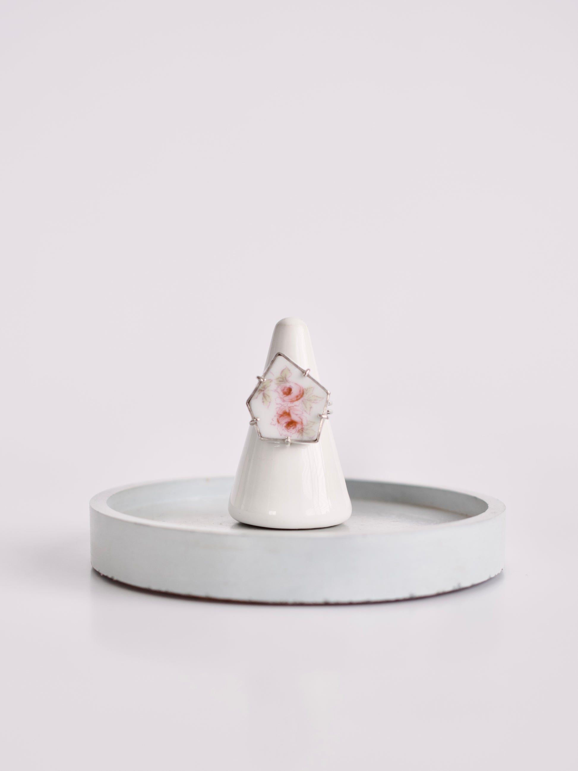Elegant and timeless, this ring features a piece of broken plate with a delicate soft pink rose design. Set in sterling silver, the polished finish highlights the gentle beauty of the plate. Handcrafted with care, it’s a one-of-a-kind piece that adds a touch of romance to any look.