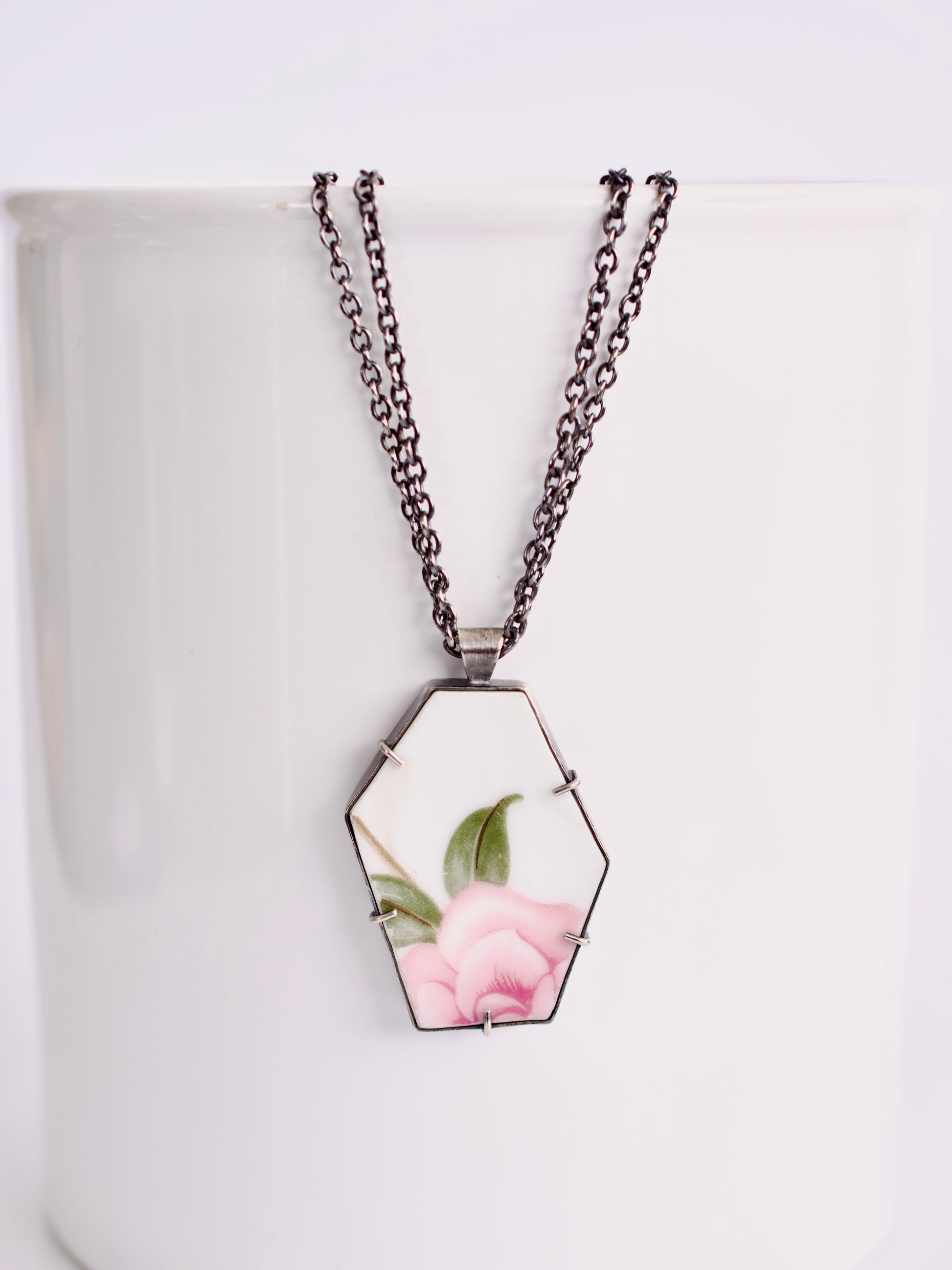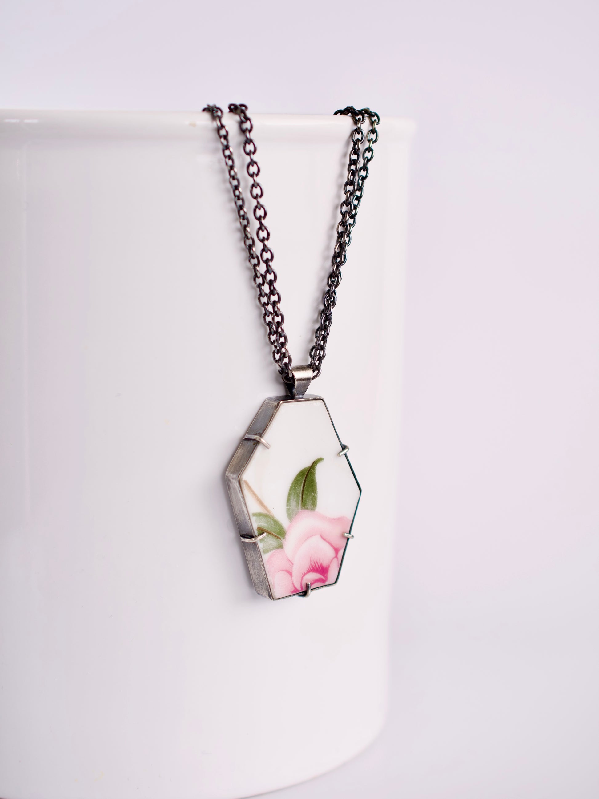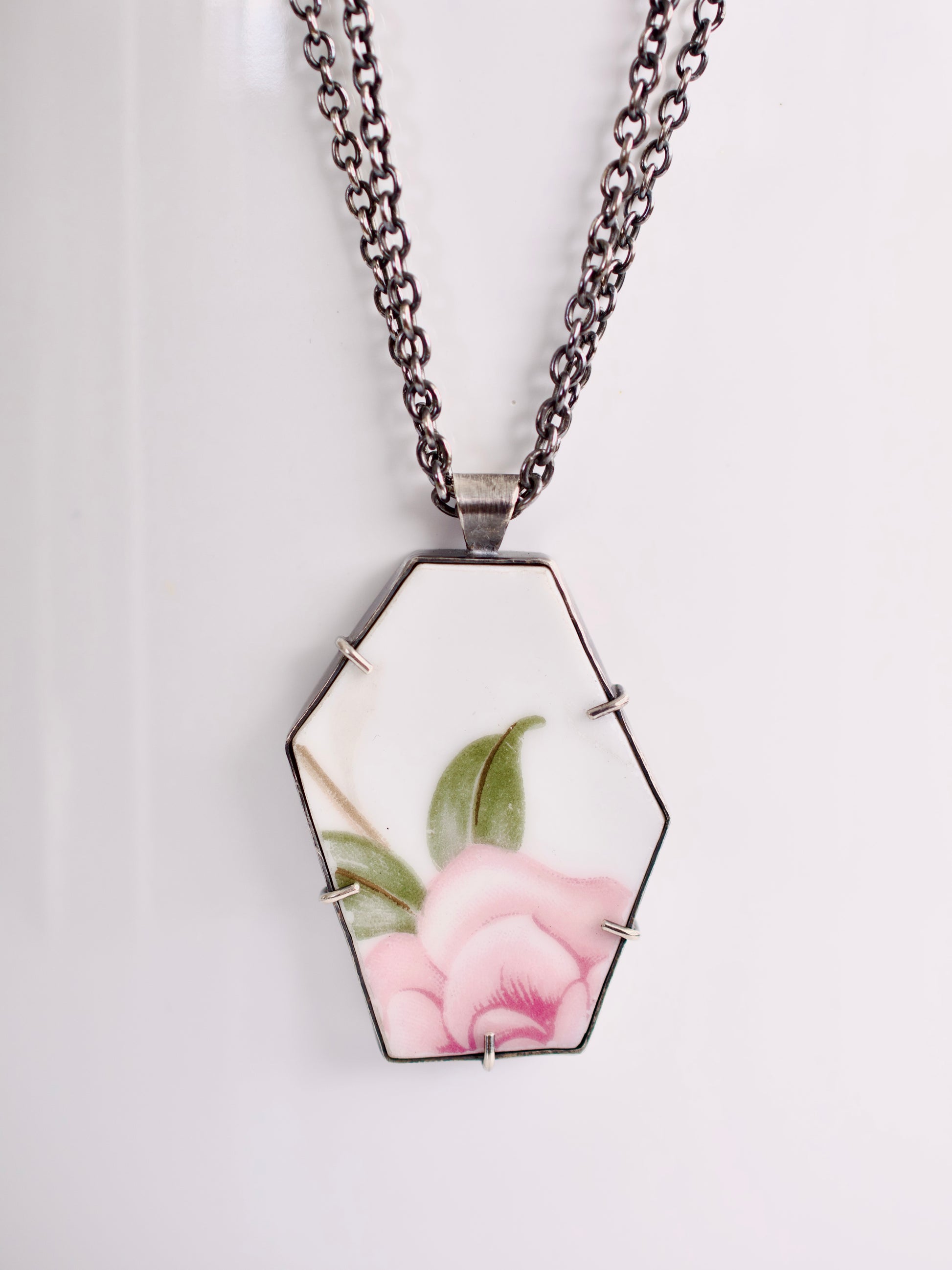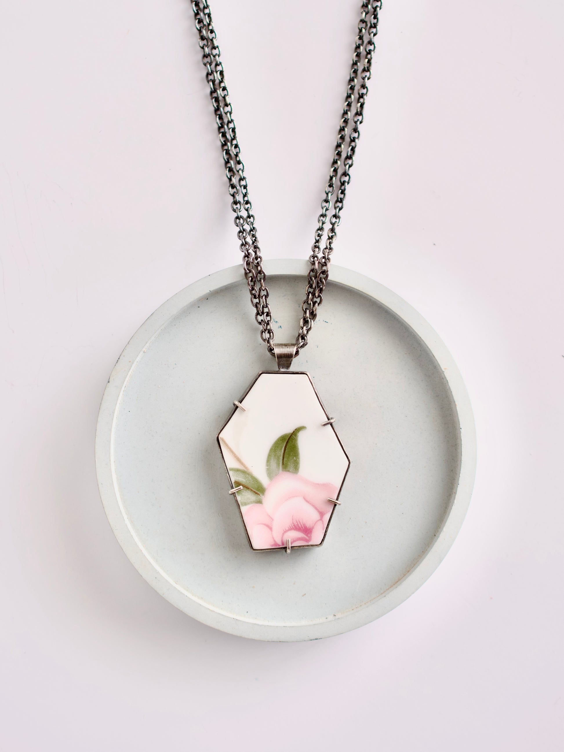 Bold yet elegant, this statement necklace features a piece of broken plate with a soft pink rose design. The pendant is framed in sterling silver with slight oxidation, adding warmth and vintage-inspired charm. With two layered chains, this handcrafted, one-of-a-kind piece makes a striking focal point that’s both timeless and unique.