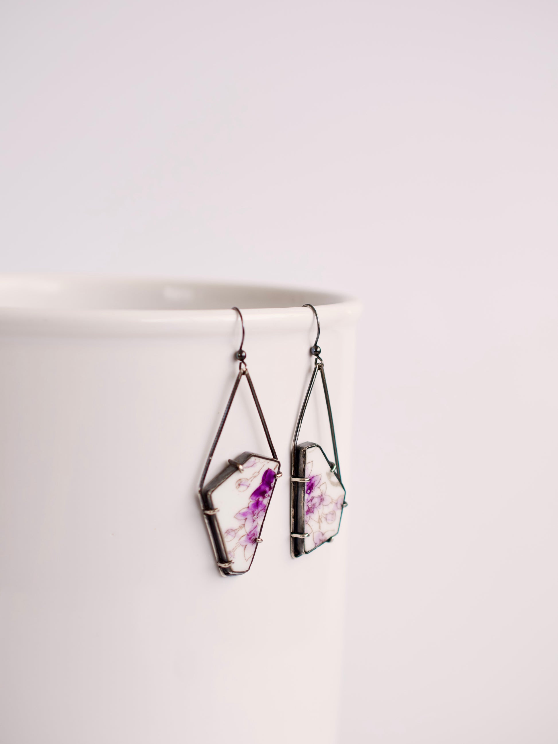 Bold and beautiful, these dangle earrings feature pieces of broken plate with a striking purple gladiolus design. The sterling silver setting has a slight oxidation, giving the piece a warm, vintage-inspired feel. Handcrafted with care, they’re a unique statement of timeless elegance.